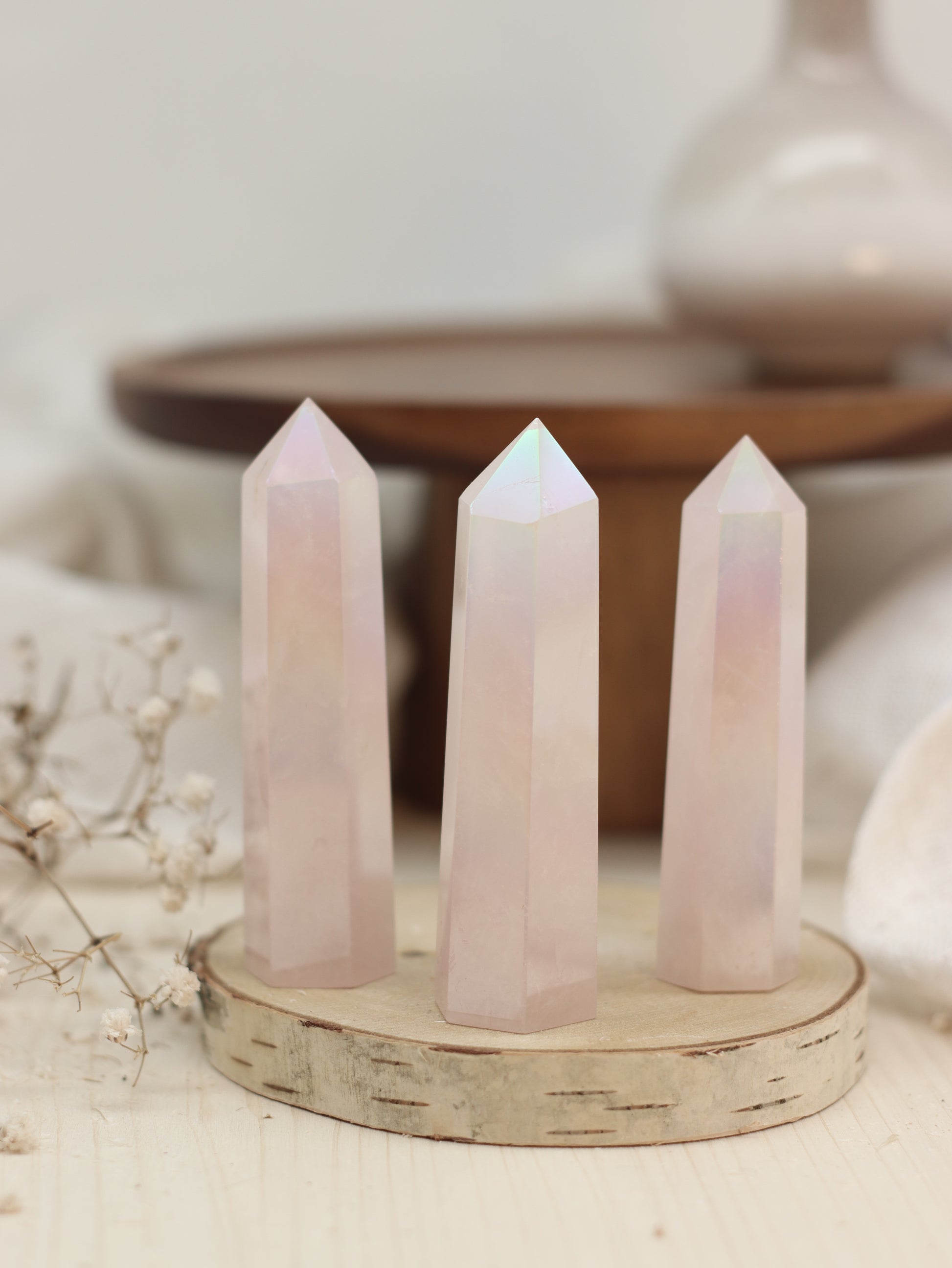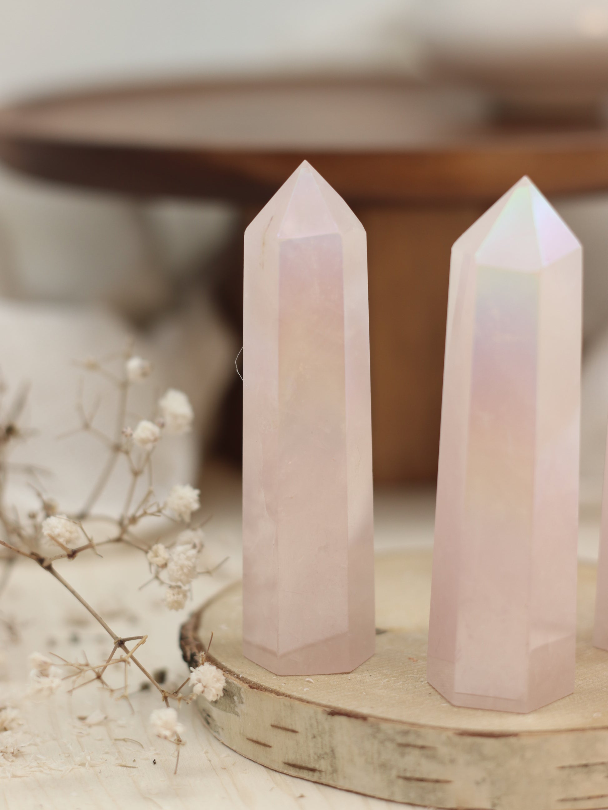 Hallo du, ich bin ein Aura Rosenquarz Turm!