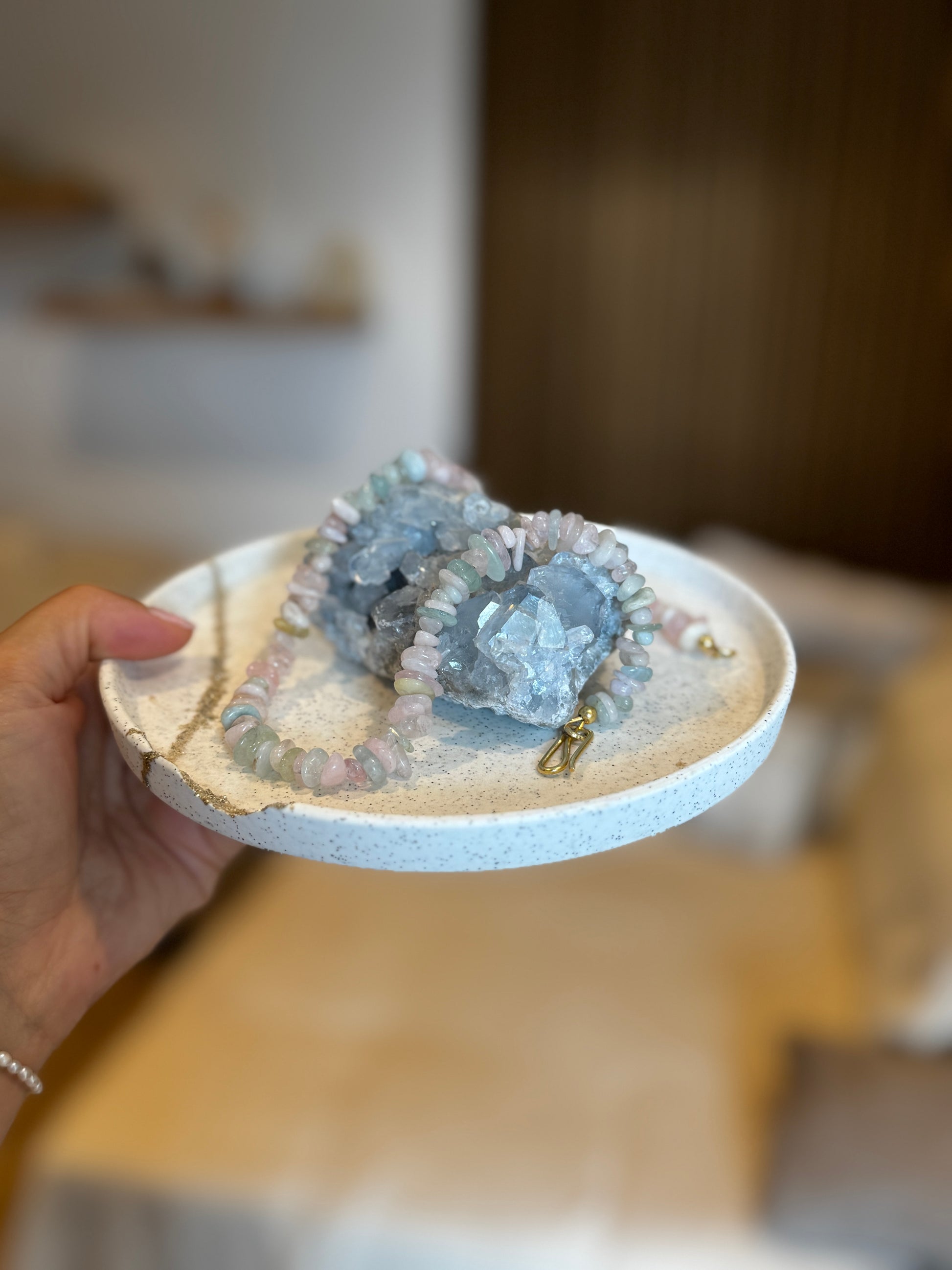 Diese Kette wirkt wie eine Brücke zwischen Himmel und Erde. Der Morganit öffnet das Herz für die sanften Botschaften der Engel, während der Aquamarin deinen inneren Kanal klärt, damit diese Botschaften in Reinheit und Wahrheit zu dir fließen können. Gemeinsam schaffen sie einen Raum, in dem du dich geborgen fühlst – gehalten von einer unsichtbaren, liebevollen Präsenz.