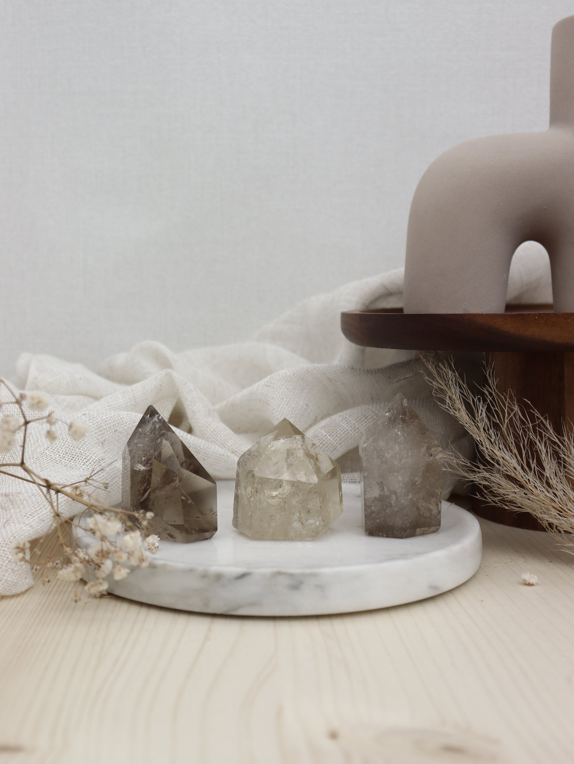 Einige Türme weisen Regenbögen auf. Abweichungen in Farbe, Größe und Form sind möglich, da es sich um ein Naturprodukt handelt. Ich wähle intuitiv, den zu dir passenden Rauchquarz Turm aus und energetisiere ihn mit dem Sternenstaub Elixier. Preis versteht sich pro Stück.