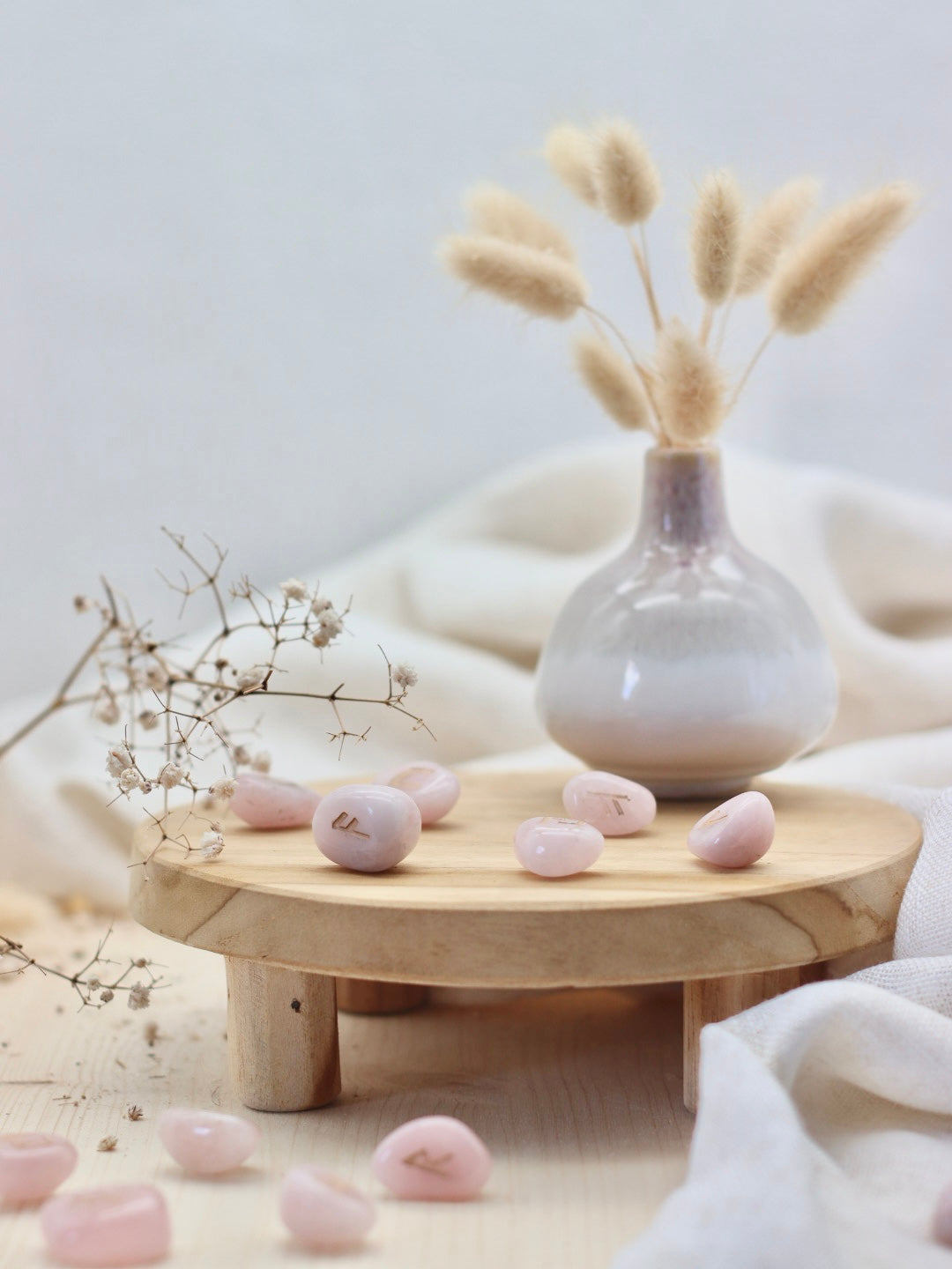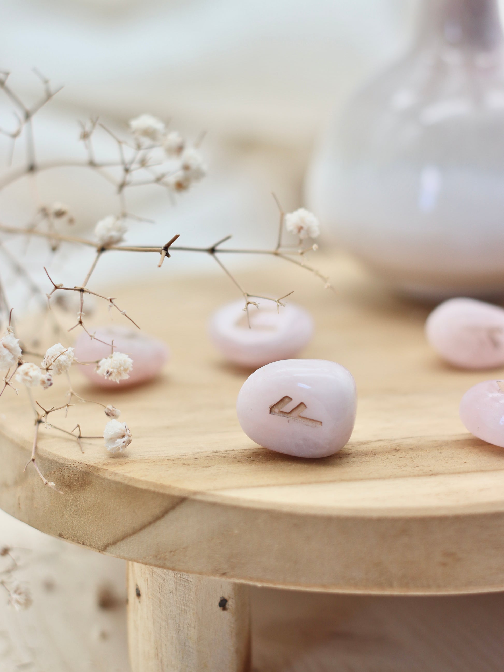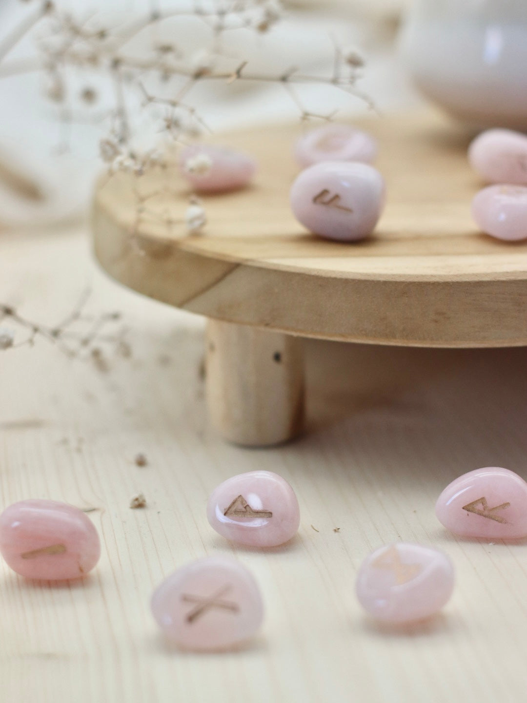 Jede einzelne Rune wurde sorgfältig auf liebevoll ausgewählten Rosenquarz-Kristallen graviert – einzigartig, naturbelassen, voller Energie. Sie tragen die Schwingung von Mitgefühl, Selbstliebe und innerem Frieden und helfen dir dabei, die Botschaften der Runen auf einer tiefen, intuitiven Ebene zu empfangen.
