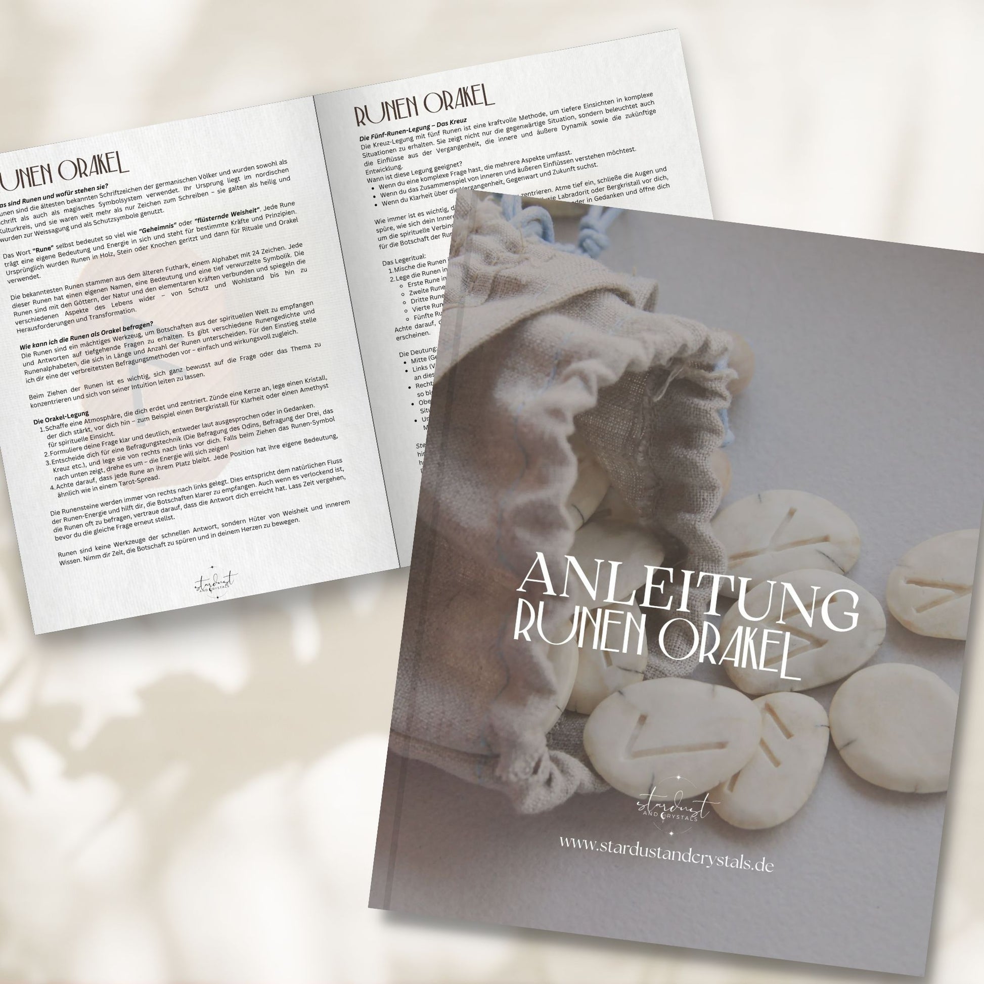 Dein Set kommt in einem natürlichen Baumwollsäckchen zu dir, energetisiert mit Sternenstaub Elixier – bereit, deine spirituelle Praxis zu bereichern und dir als liebevoller Kompass zur Seite zu stehen. Zudem sind enthalten 24 Runen + 1 Leerstein aus echtem Rosenquarz und per Mail folgt eine ausführliche Anleitung mit liebevollen Erklärungen zur Bedeutung jeder Rune und zur Anwendung des Orakels