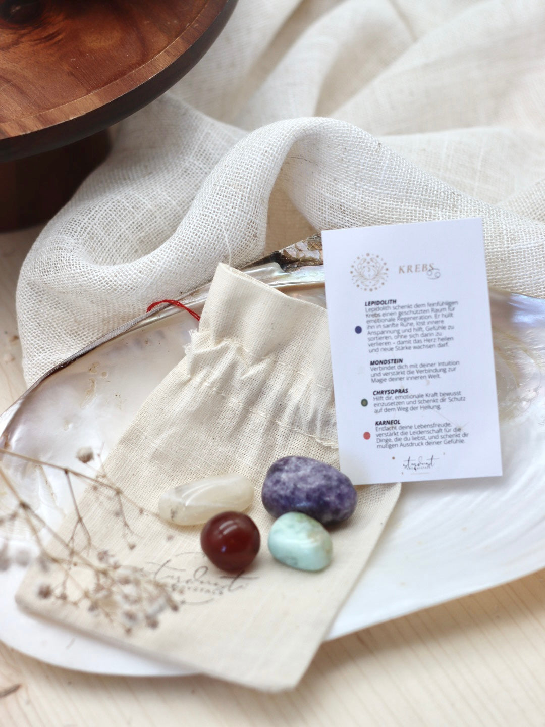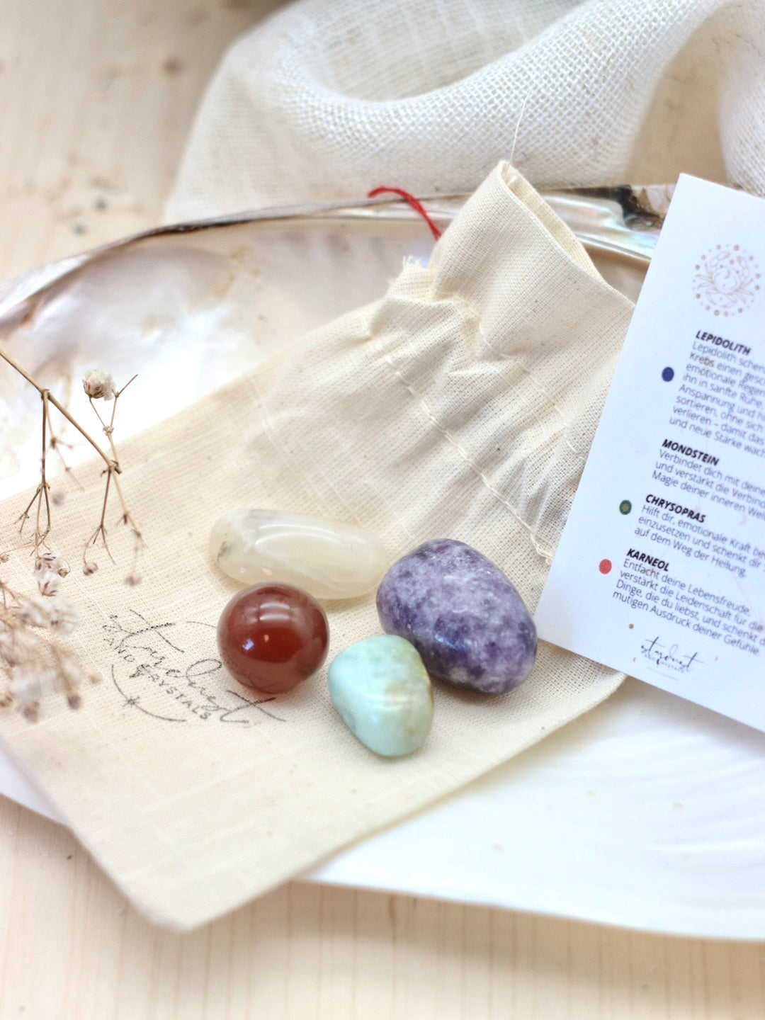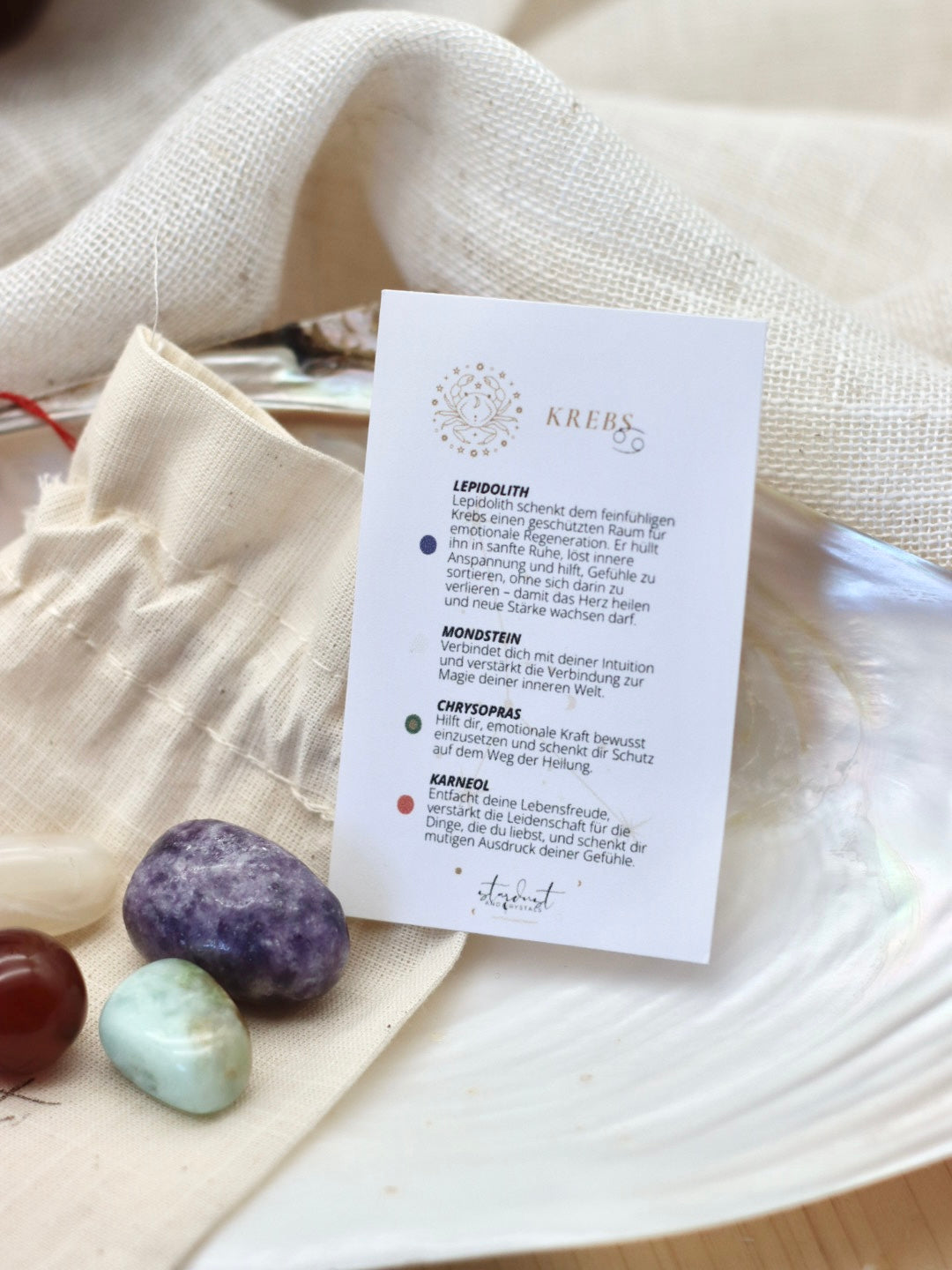 Hallo du, ich bin ein Sternzeichen Set für den Krebs und folgende Kristalle sind enthalten: