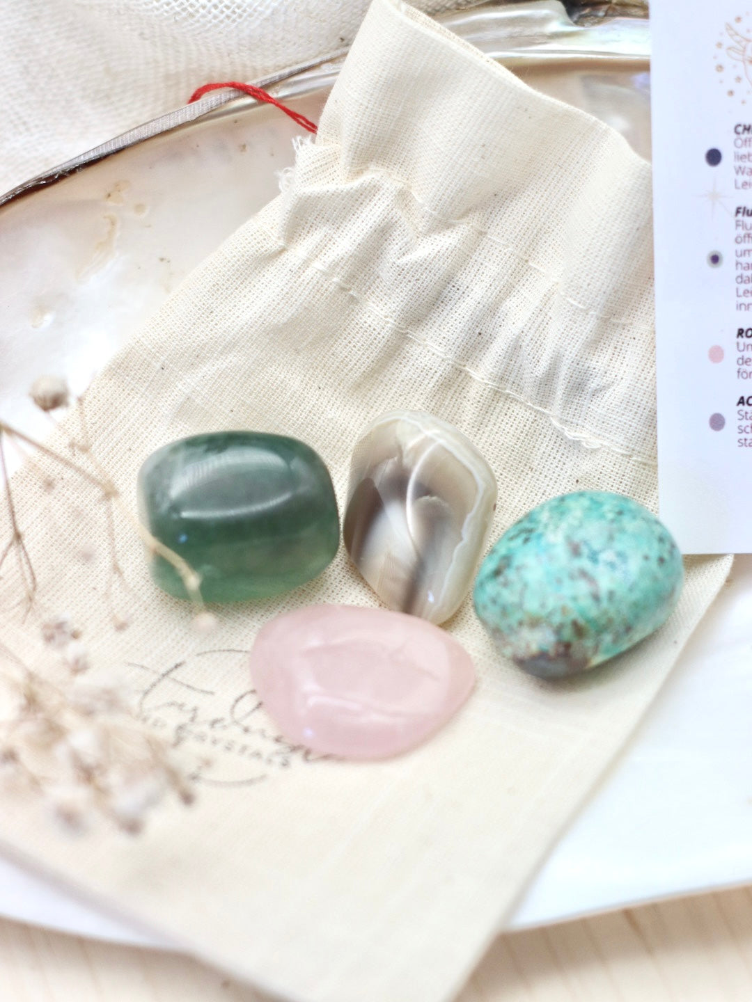 1 liebevoll gestaltete Begleitkarte mit den Bedeutungen der Steine